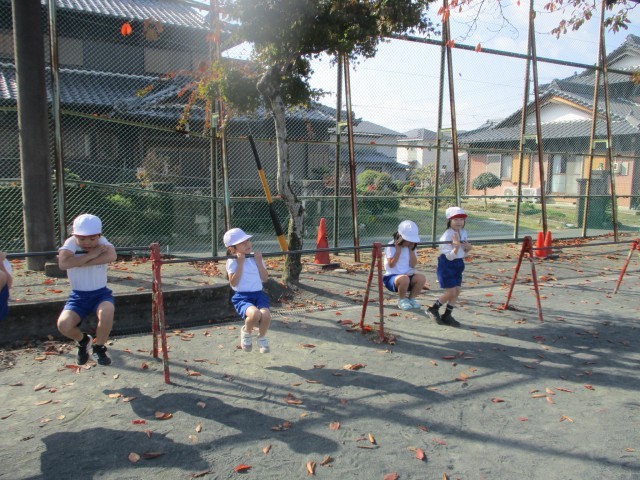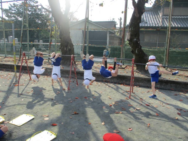 外の体育では鉄棒あそびをしています。つばめ、ふとんほし、だんごむし、こうもり、前回り下りなどいろいろな技に挑戦しています。おさるさんは出来るかな?地球回りってどうやってやるのかな?