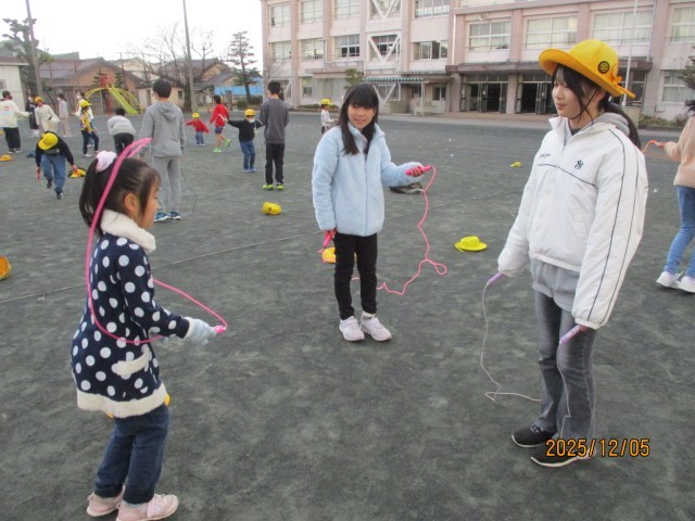 その後、跳び方を教えてもらったり、二人跳びで一緒に跳んだりしました。6年生のみなさんがとても優しくて、こころがほかほかになりました。また一緒に遊んでね。