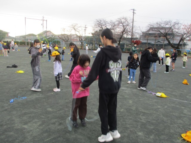 今朝は、ペアのお兄さんお姉さんと一緒に縄跳びをしました。お兄さん・お姉さんのリズムなわとびや、二重跳び、はやぶさなど見せてもらってびっくり!