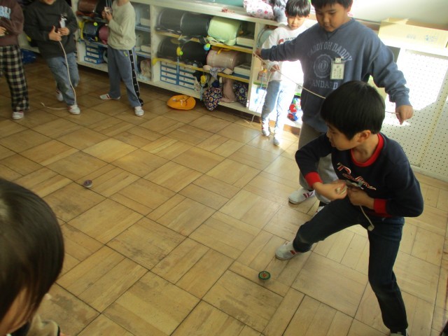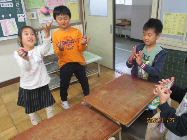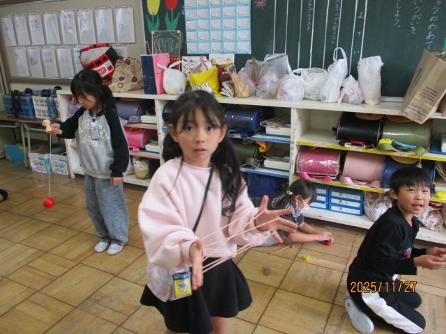 放課はけん玉、あやとり、お手玉、こま、だるまおとしを一生懸命練習しています。お友だちと教えあっこしながらだんだん上手になってきました。上手にできるコツが分かったかな?