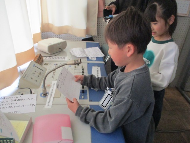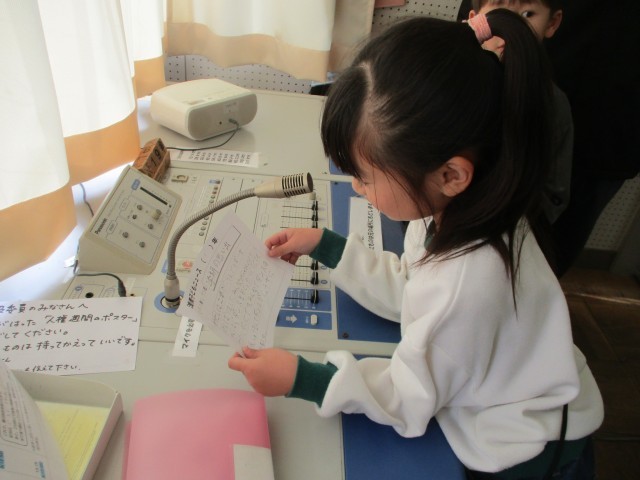 今日は昼の放送で1年生のお友だちが「2学期の思い出」について話をしました。運動会や遠足…2学期も楽しいことがたくさんありましたね。二人共落ち着いて上手に発表できました。教室では聞いていたみんなから大きな拍手がおこりました。「上手だったよ!」「すごいね!」とみんなに褒められてとても嬉しそうでした。
