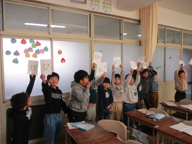 算数の「大きいかず」では、100まで学習しました。おはじきゲームでは「10がいくつと1がいくつ」という見方を学習しました。また、数の大小を比べる学習では、カードを使ってみんなで順番を考えました。いよいよ今週は100を超える数に入ります。