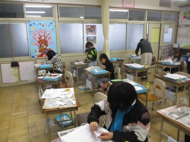 紙版画の台紙を完成させようと放課になっても頑張っていました。