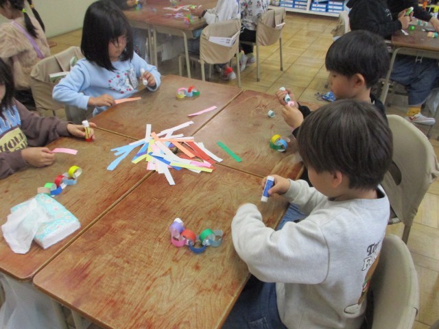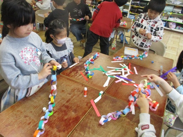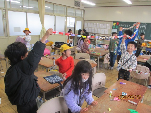 生活科の「新しい1年生を迎えよう」で、教室飾りを作っています。自分たちがドキドキしながら入学した時のことを思い出し、今度は自分たちが小さいお友だちのために頑張っています。