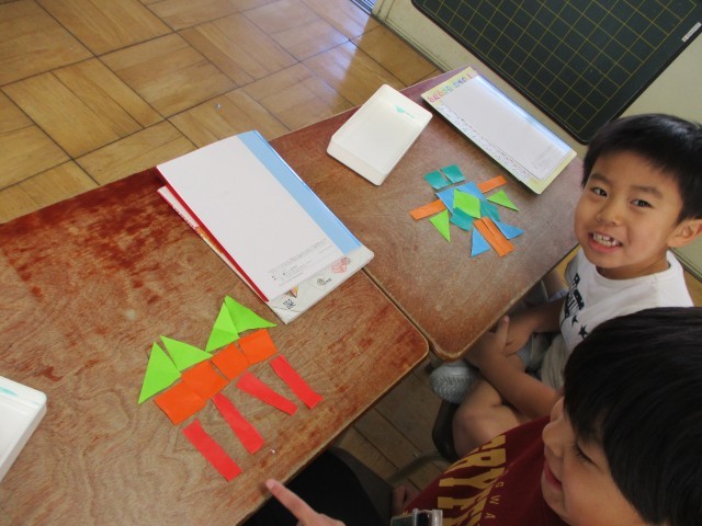 算数の「もうすぐ2年生」では、今までの復習問題がたくさん!形づくりを楽しみました。
