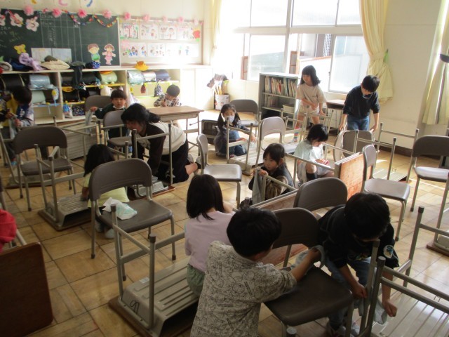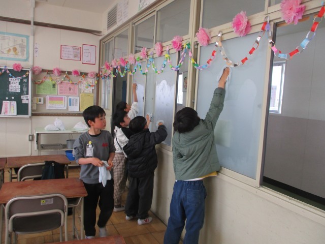 5時間目は大掃除をしました。まずは、1年間使った机や椅子を綺麗に拭きました。「1年間、ありがとう」感謝の気もちを込めてみんな一生懸命拭いていました。
