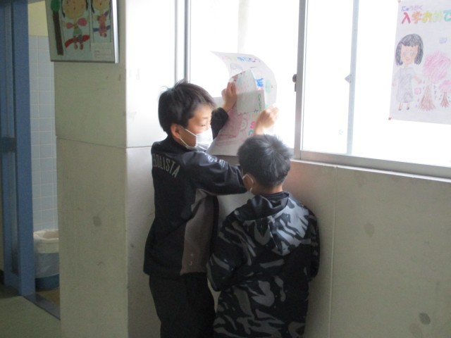今日は、2年生のペアの子が、読み聞かせのお礼のお手紙を届けてくれました。どの子も、もらった手紙をうれしそうに眺めていました。今日は、新1年生の子を迎える準備も始めました。全校の子が書いてくれたポスターや、5年生が新1年生の子に向けたお手紙を飾りました。新1年生の子との出会いが楽しみですね!