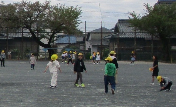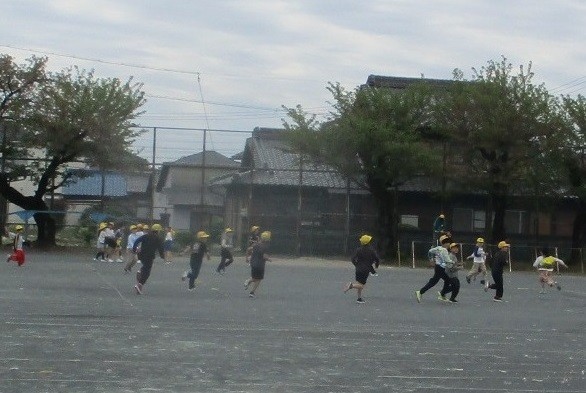 中間放課(休み時間)には,元気よく運動場に飛び出す子どもたちがいっぱいでした。ぶつかって怪我をしいないように割り振られた学年の場所を使って,鬼ごっこや,サッカー,バスケットボールをして汗を流す姿が見られました。