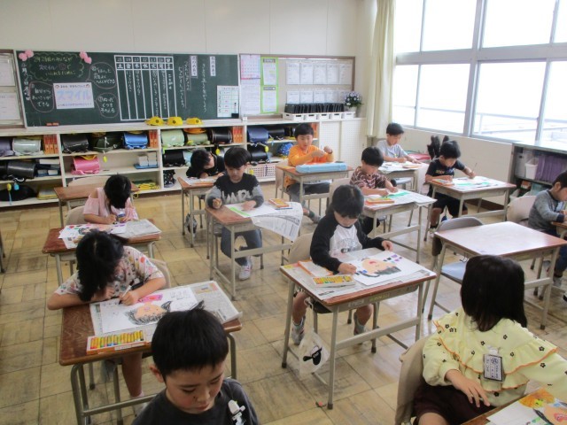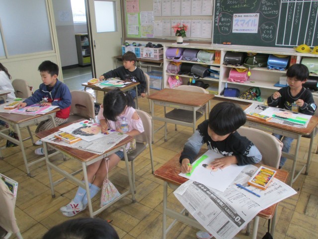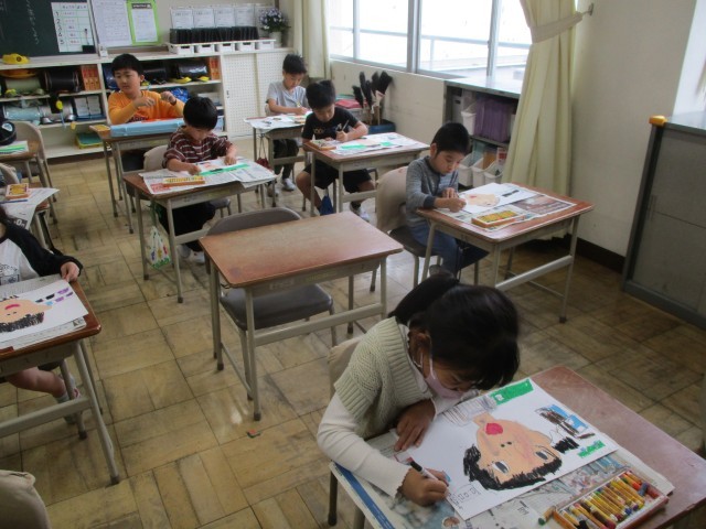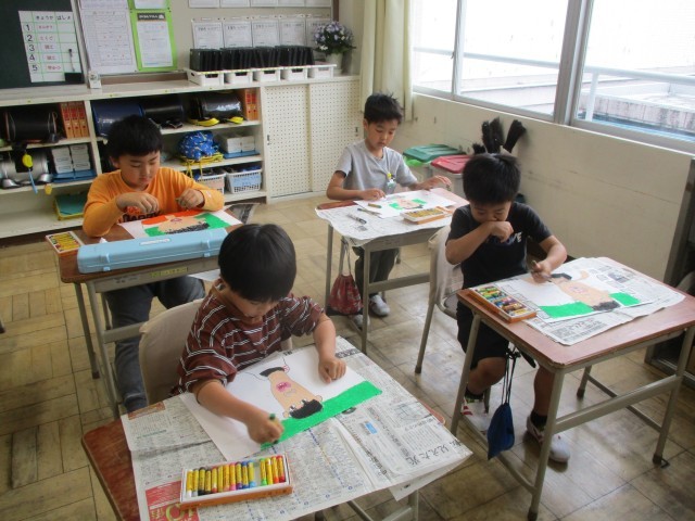 今日の図工の時間は鏡を見ながら、自分の顔を描きました。みんな一生懸命描いていました。とってもすてきな作品ができあがりました。