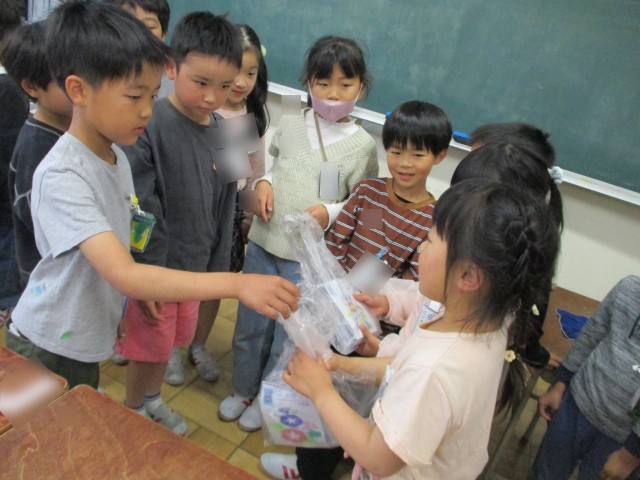手作りの白い袋には、あさがおの絵とお手紙がついていました。中身は…2年生のお兄さん・お姉さんが大事に育てた「あさがおの種」。みんなとっても嬉しそうでした!2年生のみなさん、ありがとうございました。
