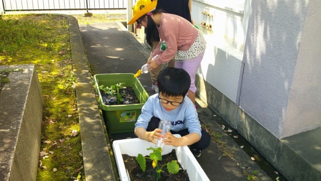 昨日植えた野菜の苗に水をたっぷりあげました。