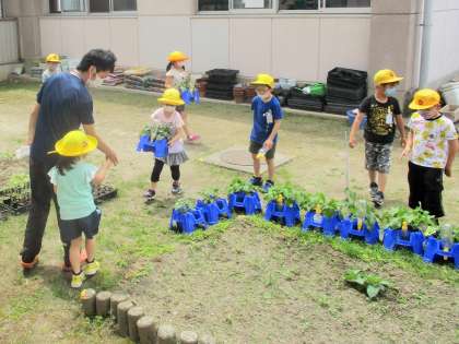 ・お家の方に持ってきていただいたアサガオの鉢を中庭に運びました。