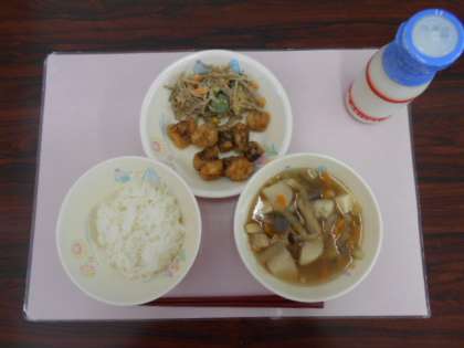 今日の給食は、ごはん、牛乳、いものこ汁、たこのから揚げ、カミカミサラダです。