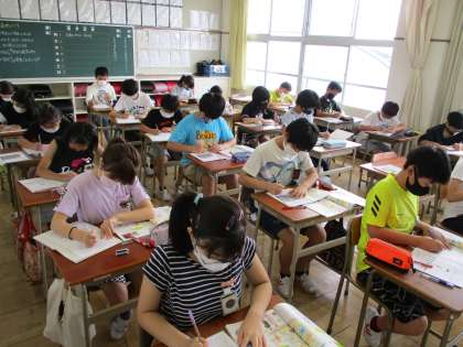 エアコンを使うと涼しいけれど電気代がかかる、風通しをよくするために窓や扉を開けるなど、教科書の挿し絵をみて、長所と課題について考えることができました。真剣に考える姿をみて、高学年としてのやる気を感じました。