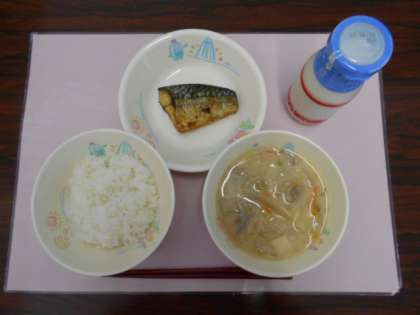今日の献立は、ごはん、牛乳、豆乳みそ汁、さばの塩焼きです。
