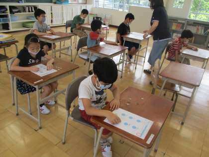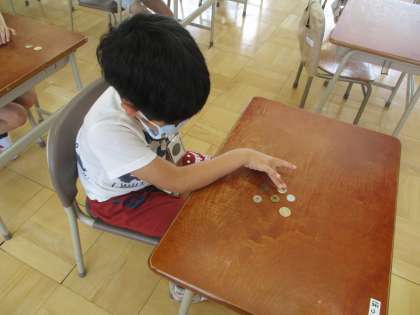 算数の時間 お金の学習をしました。本物のお金を使い今日は硬貨の種類を確認しました。それぞれの硬貨の違いに気付き、金額の高い硬貨を順番に覚えました。