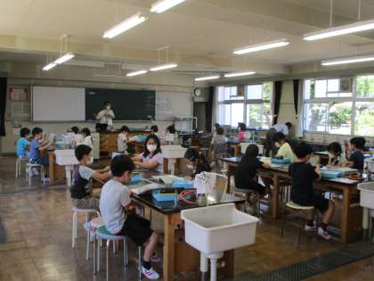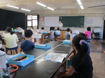 今日の理科の授業の様子です。理科室に「持ち物7点セット」をもって毎時間向かいます。みんな理科の授業が楽しみなようで、授業前には、素早く準備を整えて廊下に並んでいます。何事にも全力で楽しみながら取り組もうとする姿が素敵な4年生です。