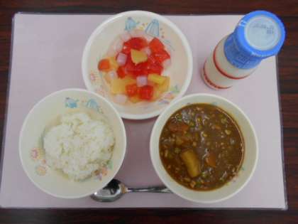 今日の献立は、ごはん、牛乳、ポークカレー、さくらんぼゼリー和えです。