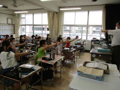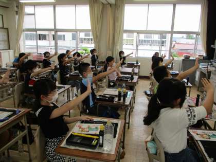 今年度初の書写の授業がありました。今年は、稲垣先生に教えてもらいます。初めに、筆の始筆の練習をみんなで空書きしました。斜め45度がポイントですね。実際に筆で書くときも、常に気をつけたいことですね。