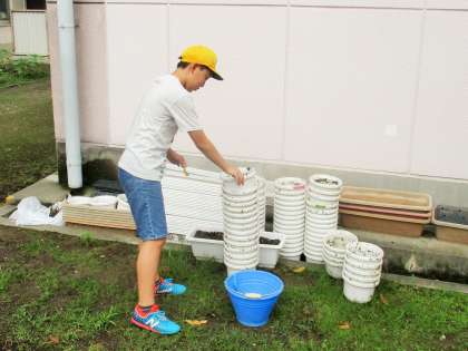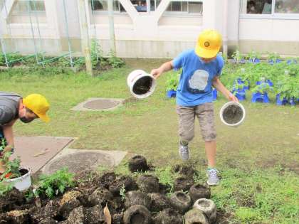 今日はそのビオラの、植木鉢の土の処理を6年生児童が進んで手伝ってくれました。