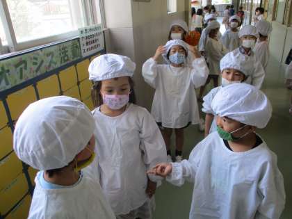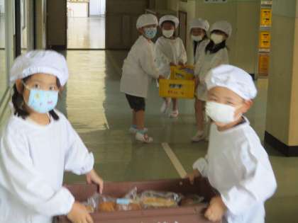 昨日から、給食当番の仕事が始まりました。まずは、エプロンを着て、担当の食器などをコンテナ室から教室へ運びます。力を合わせて一生懸命持ってきてくれています。もっとお仕事をしたそうです。これから少しずつ、配膳もしてもらおうと思っています。