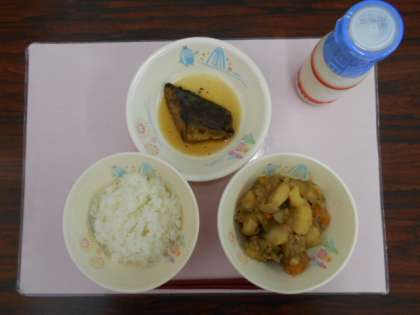 今日の献立は、ごはん、牛乳、新じゃがのそぼろ煮、あじのしろしょうゆ焼きです。