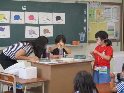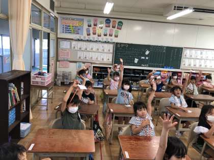 本日、ALTと一緒に初めて英語の学習をしました。先生に質問をしたり、歌に合わせて体を動かしたり、色の英語での言い方を覚えたりしました。