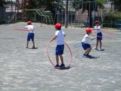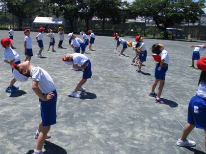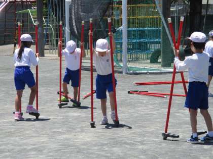 竹馬とフラフープの練習をしました。フラフープを回したり、縄跳びのように跳んだりするのは、上手にできる子が多くいました。竹馬は、乗ることができない子ばかりでした。来週からは、放課に体育器具庫の中の遊具も使えるので、竹馬に乗ることができるように練習を続けて欲しいと思います。