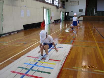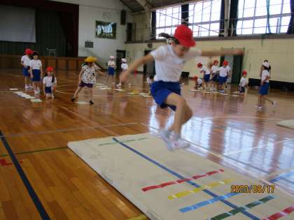 まずは、「ケン・パ」のリズムで跳び、踏み切り足を決め、着地の仕方も覚えました。
