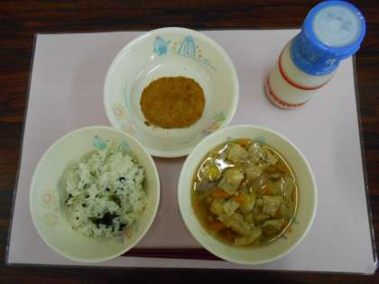 今日の献立は、ごはん、牛乳、湯葉のすまし汁、牛肉コロッケです。