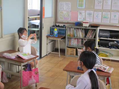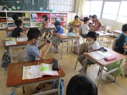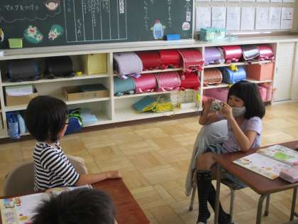 来週の町探検に向けて、生活科でデジタルカメラの使い方を勉強しました。学習後、隣の友達の写真を撮る練習をしました。