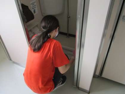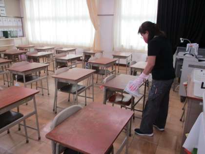 子どもたちが帰った後、先生たちは教室の机の除菌やトイレ掃除をしています。