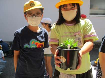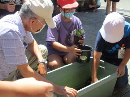 4年生は総合的な学習の時間で学習する「菊作り」について学習を始めました。2人で1つ、苗ポットから鉢に菊の苗を植え替えました。
