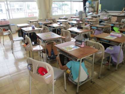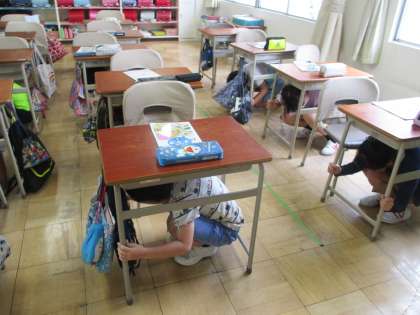 雨のため、外に出る避難の訓練はできませんでしたが、机の下に素早くもぐり頭と体を守る練習を行うことができました。