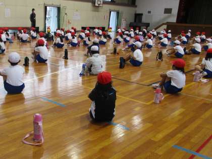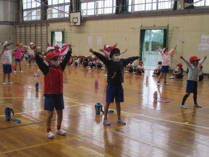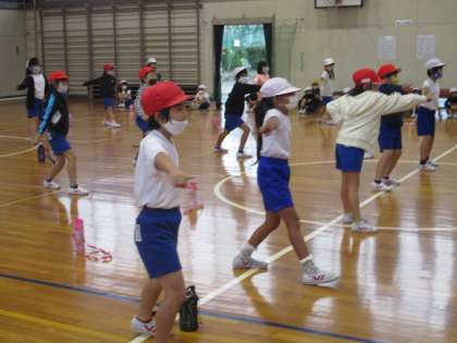 1、2年生合同でダンスの練習をしました。1年生と合わせてダンスをしたり、1年生にダンスを見せたりしました。1年生と並んで踊ると、2年生らしくリズムにのって力強く踊り、「さすが2年生」と感じました。