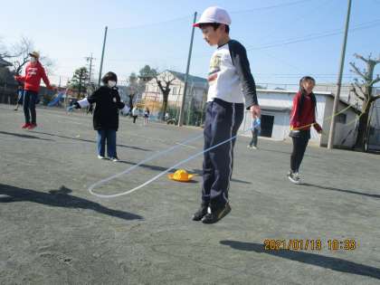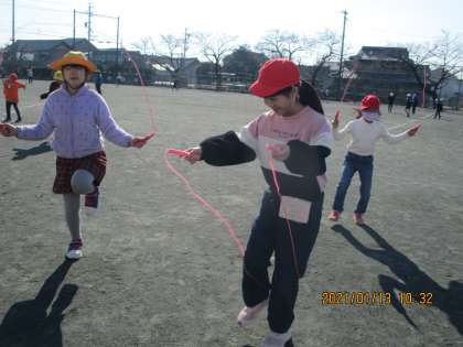 放課も元気いっぱいなわとびの練習に取り組んでいます。縄跳び検定の曲に合わせてリズムよく飛んでいました。友達と声を掛け合いながら笑顔で過ごす姿が見られ、嬉しく思います。