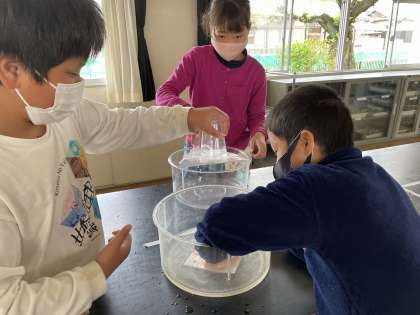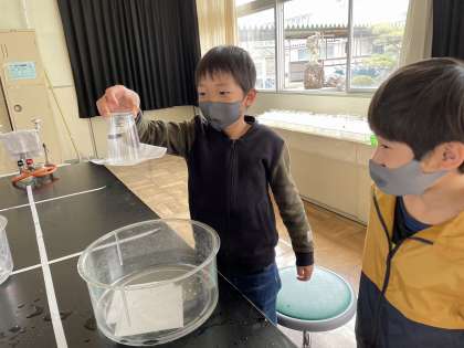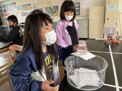 4年生での初めての理科でした。水を使った実験をしました。どうしたら、コップをひっくり返しても水がこぼれないのか量などを考えて実験をしていました。