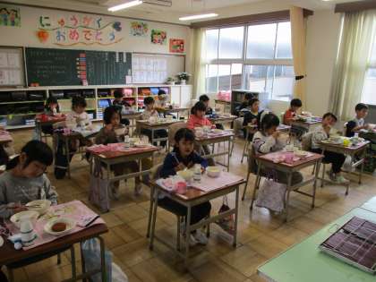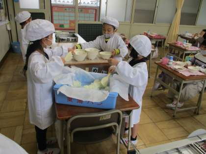A班の子が給食当番を頑張って行っています。みんな同じぐらいの量になるようにご飯やおかずをよそいました。こぼさないようにお皿を持って、手際よく運ぶこともできました。
