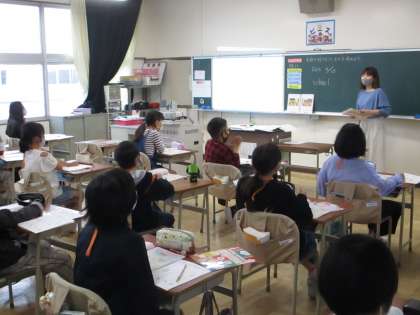 さすが高学年、英語を使って自信をもって発言しています。「グット ジョブ」学校中にある、教室や特別教室を英語で伝える練習をしました。