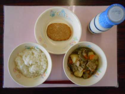 今日の献立は、ごはん、牛乳、肉じゃが、ボロニアステーキです。