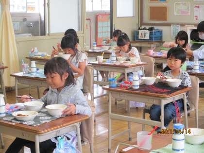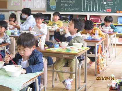 給食では、新型コロナウイルス感染症予防の為、「黙食」をルールにしています。1年生はルールをしっかり守って静かに給食の時間を楽しんでいます。「おいしかった!」と笑顔で教えてくれる素直でかわいらしい1年生です。