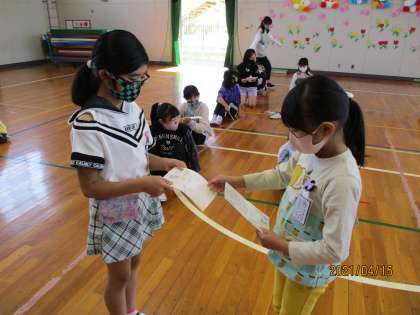 本日の児童集会の中でペア結成式が行われました。子どもたちが一人ひとり作成した名刺を、ペアの5年生のお兄さん・お姉さんに渡しました。子どもたちは名刺を渡すとき、元気に礼儀よく「よろしくお願いします。」とあいさつをすることができました。