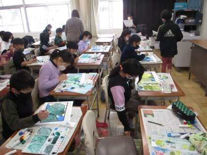 4年生の図工では、明るくなる白色と暗くなる黒色をうまくたしながら色をつくり、魚をぬりました。満足いく色が出せたようです。今後に生かしたいですね。