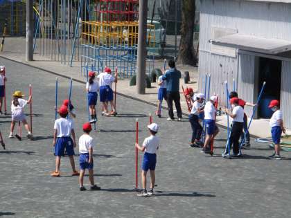4年生の体育で竹馬をしました。普段はなかなかできないことです。一人ひとりが協力をして声をかけ合い、がんばって挑戦していました。