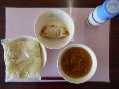今日の献立は、中華めん、牛乳、しょうゆラーメン、焼きギョーザです。