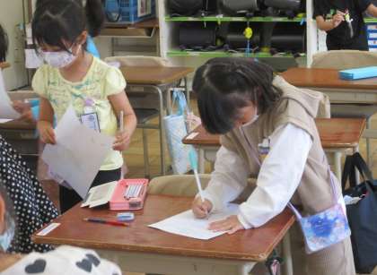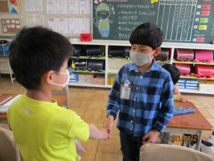 クラスの友達と自己紹介をし合って、握手をしました。恥ずかしいのか声をかけられるのを待っている子もいましたが、いろいろな子に自分から声をかけ、自己紹介をする子もいました。みんな楽しそうに活動することができました。