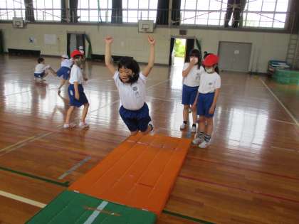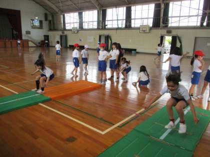 体育の授業で体力テストのために練習をしています。今日は、体育館で、ソフトボール投げのためのボールの投げ方の練習と立ち幅跳びの練習を行いました。よい記録が出るように頑張っています。