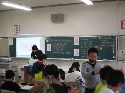 5年生の算数では、直方体の体積を求めました。いろいろな考え方があり、子どもたち同士で教え合っている姿が見られ、すばらしかったです。幅広い考え方ができるのは大切なことです。