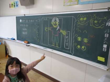 1年生の図工では、人の絵をどのようにしてかくのか学習しました。クレパスを使って大きく力強くかくことができました。