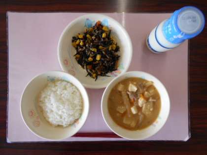 今日の献立は、ごはん、牛乳、呉汁、ひじきのいため煮です。